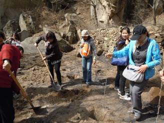 车很快来到了神堂峪风景区,大家首先来到植树现场,四人一组,领取树苗和工具后,大家都干劲十足的忙活起来,手扶树苗,填埋树坑,浇水盖土,此时此刻每个人的心里充满了快乐与自豪。不一会儿,一棵棵树苗耸立于春土中,以昂扬的姿态向世界宣布了自己的一片立足之地。