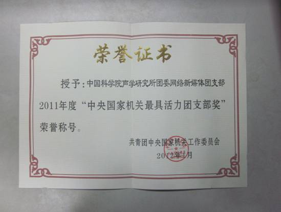 2012年1月5日、6日,在2012年中央国家机关共青团工作会议上,我所网络新媒体团支部作为科学院唯一代表被中央国家机关团工委授予2011年度“中央国家机关最具活力团支部奖”荣誉称号,网络新媒体团支部前任书记、所团委委员杨中臻作为代表进行了事迹汇报。