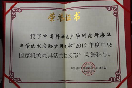 2013年3月1日,在2013年中央国家机关共青团工作会议上,我所海洋声学技术实验室团支部被中央国家机关团工委授予2012年度“中央国家机关最具活力团支部奖”荣誉称号。