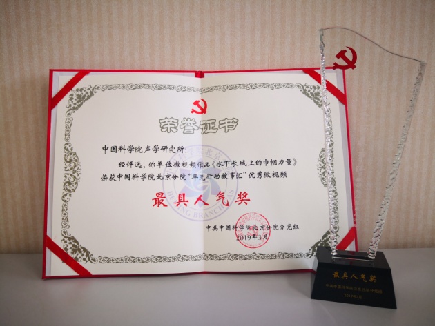 会上对“率先行动故事汇”微视频获奖作品和优秀组织单位进行了表彰,我所两部视频作品获奖,《张仁和:以心听海》荣获“家国情怀奖”,《杨娟:水下长城上的巾帼力量》荣获“创新先锋奖”和“最具人气奖”。