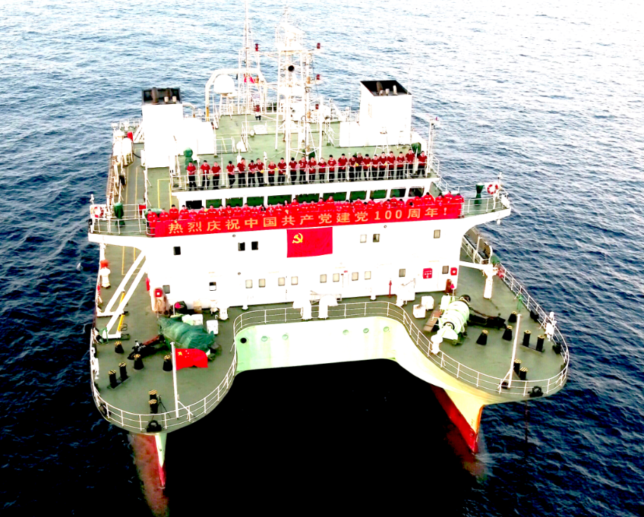 在碧海蓝天衬托下,鲜艳中国共产党党旗和“热烈庆祝中国共产党100周年”红色横幅更加光彩夺目,海洋科考2021年印度洋航次团队克服了海上骄阳暴晒、风浪扰动,全体参试人员整齐着红色海试服拼出了赤诚的“100”祝福图案,昂首挺立唱出了响亮的红歌,声震四海。