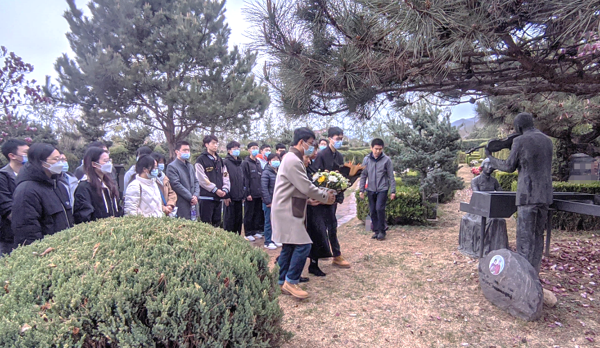 在陵园门口,同志们自觉排成两路纵队有序进入,行至汪先生的墓碑前,大家仔细擦拭了汪德昭院士及其夫人李惠年先生的铜像及墓碑。师生代表敬献了花篮,并集体向汪先生和李先生三鞠躬,以表达崇敬与悼念之情。