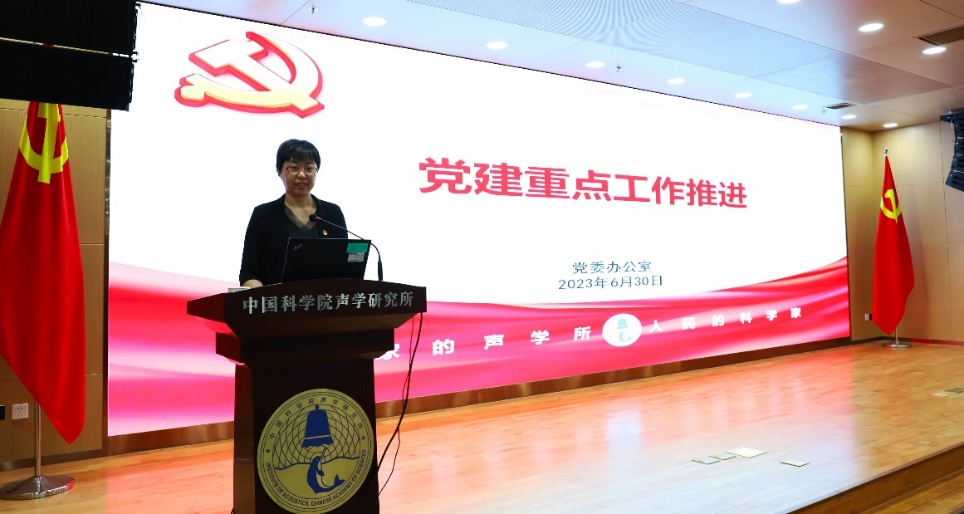 党委办公室负责人闫玮丽针对2023年党建工作要点、主题教育等重点工作的开展落实情况进行了总结,并对近期党建重点工作进行部署推进,围绕开展好主题教育学习、红色教育主题党日活动、专题党课、专题组织生活会等各项专项工作做了详细安排部署。