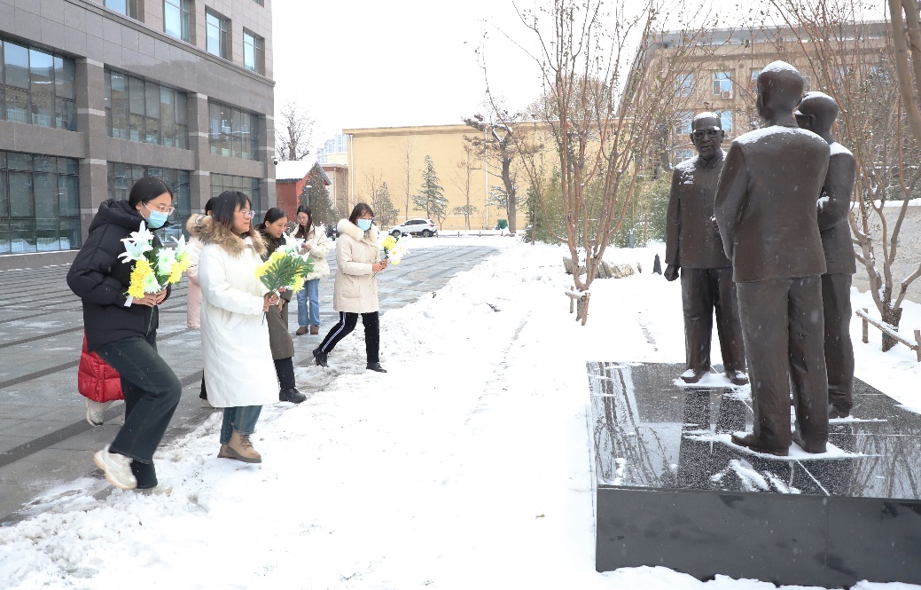 最后,青年学生代表杨馥锦带领大家瞻仰“汪德昭·马大猷·应崇福”院士塑像。全体人员向塑像三鞠躬并献上花束,代表全体同志对老科学家致以最崇高敬意。