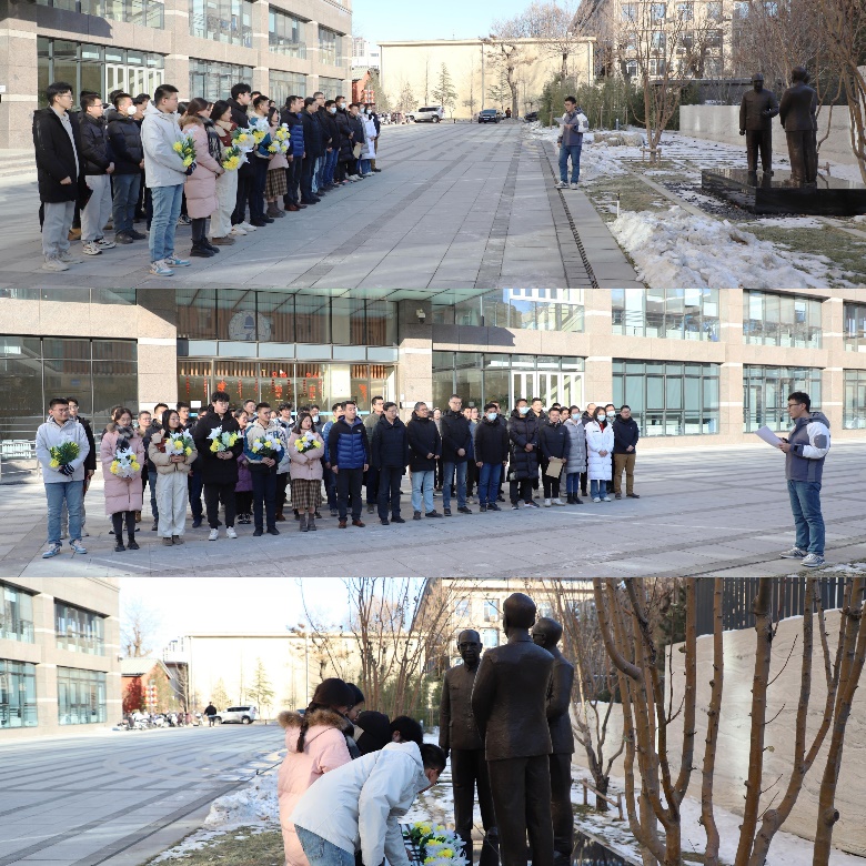 在张波的引导下,大家整齐肃立、静默凝视,瞻仰“汪德昭·马大猷·应崇福”院士塑像,感受着三位先生为科学事业的伟大贡献。大家怀着无比崇敬的心情向塑像三鞠躬,献花代表向塑像献花,表达对三位先生奋斗历程和崇高精神的深情纪念。