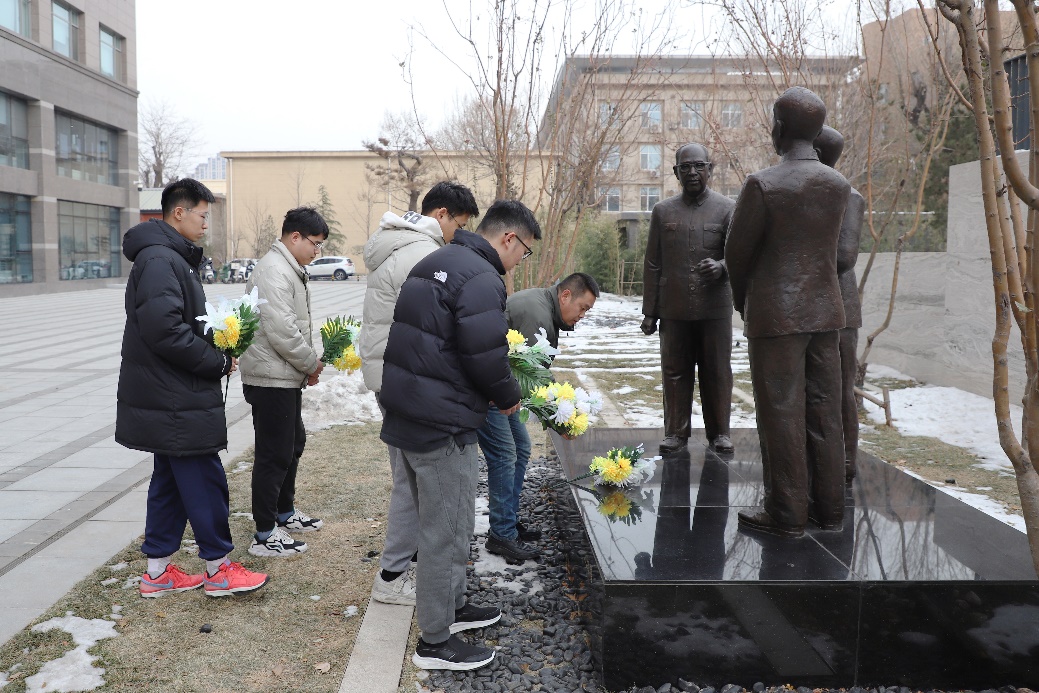 党支部书记郝程鹏和四名青年学生向院士塑像献花,深切怀念他们对声学事业发展作出的突出贡献。