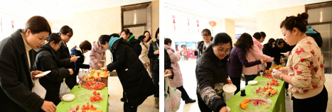 新科研楼大厅里的水果品鉴会为大家增添了味蕾上的享受,一盘盘色彩鲜艳、新鲜美味的水果摆满长桌,大家围在长桌前欢快地品尝着种类丰富的水果,或回味刚才的活动,或轻言细语谈些有趣的事情,轻松解压,幸福感、自豪感油然而生。