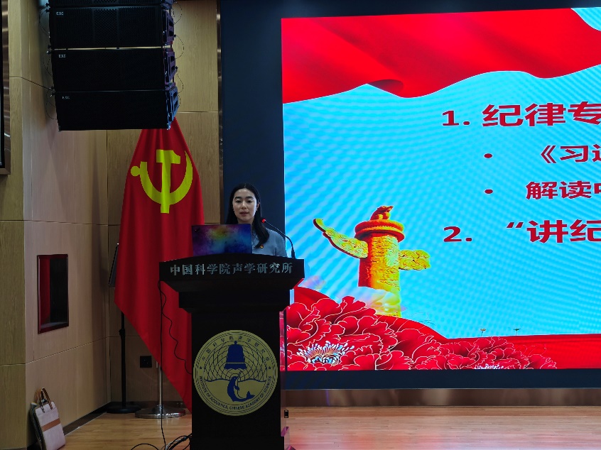 苏畅作纪律专题党课,带领与会同志深入学习领会习近平总书记关于全面加强党的纪律建设的重要论述,集中学习新修订的《中国共产党纪律处分条例》,并聚焦实际工作谈如何在科研工作中践行党的纪律,结合《三大纪律八项注意》强调纪律建设的重要性。她表示,全体党员要提升自身修养,加强党风廉政建设,持之以恒贯彻落实中央八项规定精神,在科研工作中严格遵守党的纪律和规矩,发挥好先锋模范作用。