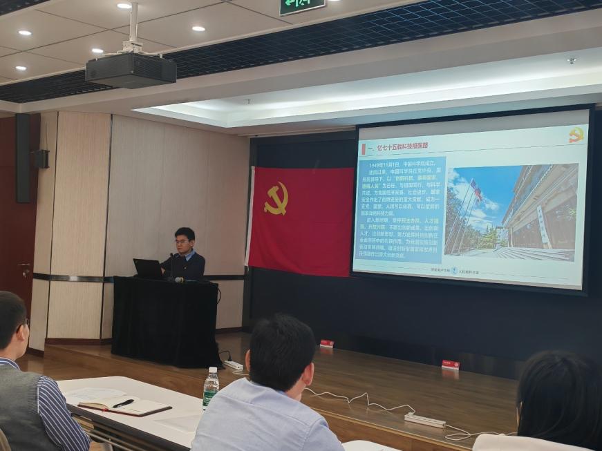朱小勇介绍了参加活动的人员情况及活动主题,第七党支部党员代表任勇毛领学中国科学院党组书记侯建国院长在建院75周年专题学习会上的讲话精神,朱小勇带领与会同志共同学习中国科学院院史,深入回顾“两弹一星”精神的宝贵财富,并作专题报告。