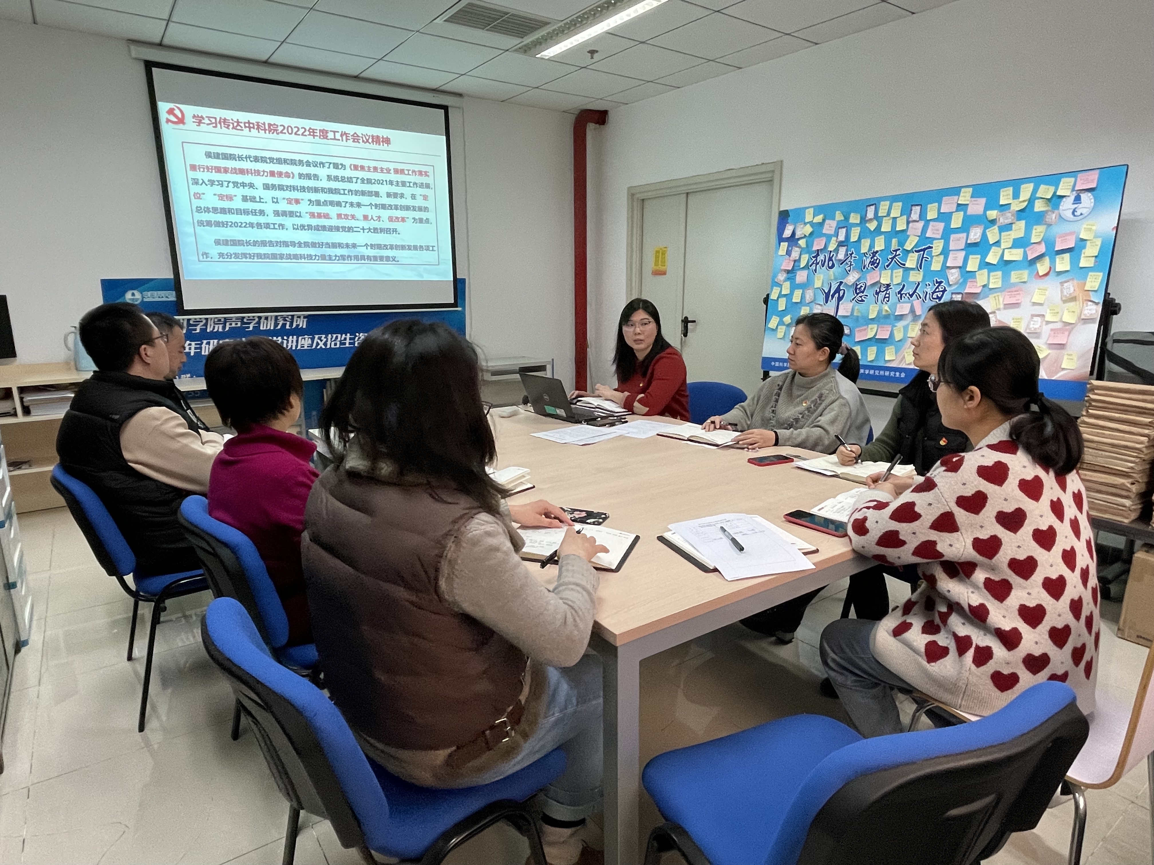 会上,首先由张莉传达并带领大家共同学习中国科学院2022年度工作会议精神。侯建国院长在2022年度院工作会议上做报告,系统总结了全院2021年主要工作进展,深入学习了党中央、国务院对科技创新和我院工作的新部署、新要求,在“定位”“定标”基础上,以“定事”为重点明确了未来一个时期改革创新发展的总体思路和目标任务,强调要以“强基础、抓攻关、聚人才、促改革”为重点,统筹做好2022年各项工作,以优异成绩迎接党的二十大胜利召开。随后,张莉传达了赢乐welcome2022年度工作会议精神和最新党委会会议精神。