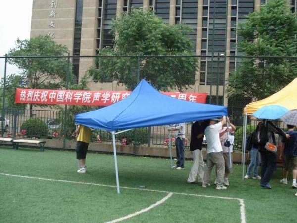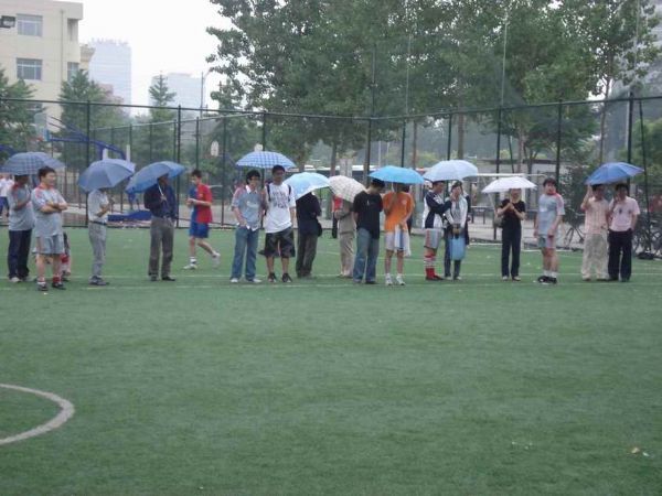 5月21日下午,“所庆杯”足球比赛的决赛如期在中关村体育场举行。虽然比赛前天空下起了雨,但是这点小雨一点也没有浇灭广大师生关注“所庆杯”决赛的热情。赛前就有大批的啦啦队到达比赛场地,现场的工作人员还很细心地为大家支起了挡雨的帐篷。