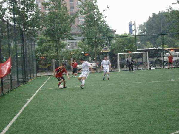 5点10分,随着裁判一声哨响,决赛正式打响。交战的双方分别为五部和噪声与振动实验室,双方都是一路过关斩将,其中噪声与振动实验室更是以全胜的战绩强势晋级决赛。双方的前锋裴朝科和尹铫都是各自球队的核心人物,自球赛开始以来几乎场场进球,为球队攻城拔寨立下汗马功劳,因此本场比赛也是两位优秀前锋的较量。高手过招自是分外小心,比赛开始后双方都比较重视防守,没有给对方太多的机会,虽然如此,但场面依然非常激烈,双方你来我往,攻势一浪高过一浪。最终还是五部率先抓住对手门前的一次失误,在第16分钟由裴朝科攻入第一粒进球。失球后的噪声与振动实验室显然加强了进攻的力度,频频压上威胁五部的球门。但五部的防守却还是有条不紊,化解了对方一次次的攻势。时间一分一秒的过去,眼看就要以五部的领先进入中场休息时,尹铫站了出来,就在中场前不久,噪声与振动在禁区右路组织攻势,尹铫以一个后脚跟射门把大家都骗过了,当然也包括五部的门将,皮球应声入网。双方以平局进入下半场。