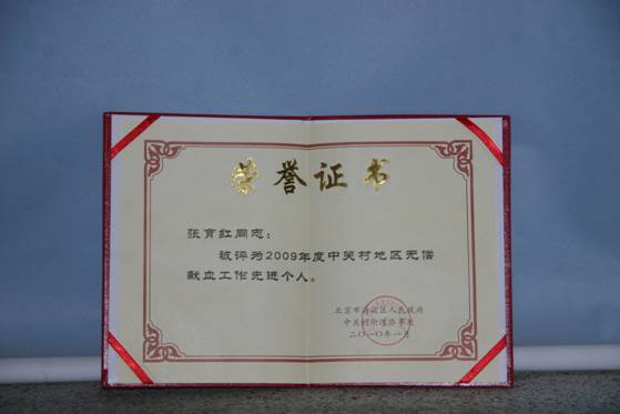 近日,中关村街道对在2009年度无偿献血工作中表现突出的个人和集体进行了集中表彰,赢乐welcome张育红同志表现突出,荣获“无偿献血先进个人”荣誉称号。