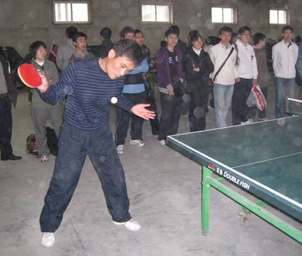 第二轮女单比赛,高瑞华老师英姿飒爽直落两盘,为我们所扳回一成。比赛进入到关键的第三局,我所乒协主席闫浩应战。闫浩同学球风稳健,进攻凌厉,防守严密,在以往的友谊赛中展现出高超的球技以及良好的心理素质。这次他的对手是一位精神矍铄的教师,反应灵敏,动作标准,举手投足显示出受过专业的风格。比赛伊始,闫浩凭借发球先声夺人,但是接下来的一个失误让对手追回一分并一直领先。最终惜败。