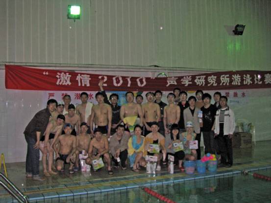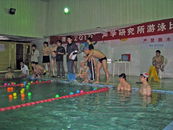 为了活跃科研氛围,加强体育锻炼,增进感情交流,选拔游泳健将,在所研究生会、工会、团委的支持和帮助下,2010年4月10日上午,“激情2010”声学研究所游泳比赛如期于中国科学院研究生院中关村园区青年公寓游泳馆举行。这次比赛由游泳协会承办,比赛过程紧凑、顺利、较有秩序。