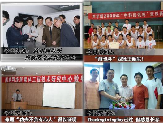 9点半,首先播出的新媒体团支部制作的视频片头,以早间新闻的形式回顾了网络新媒体历年来的重大事件迎接路甬祥院长参观、国家工程中心申请、验收,以及党支部大会、海迅杯四冠王等事件。视频以轻松搞笑的方式迅速调动了大家的情绪,让大家看到了网络新媒体中心师生在日常生活中的风度翩翩、大方洒脱,在科研工作中的开拓创新、指点江山。当视频的画面一次又一次的将师兄师姐们昔日的风采展现出来的时候,现场一次又一次的欢笑声、掌声此起彼伏,是啊,这里是他们曾经挥洒青春的沃土,这里有他们最温馨的回忆,任岁月无情流逝,片刻的驻足也足以让他们感触满怀。