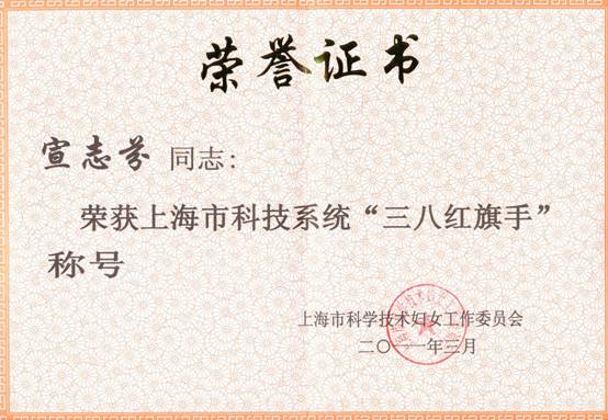 为纪念三八国际劳动妇女节,表彰上海市科技系统中在社会建设中作出突出贡献的妇女同志,上海市科学技术妇女工作委员会于3月8日上午召开上海市科技系统妇女先进表彰大会。大会表彰了一批先进集体和个人,我站宣志芬同志荣获上海市科技系统“三八红旗手”称号。