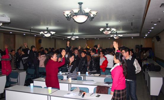 首先,王老师一上来就利用现场互动的形式调动大家的积极性,进而提出了2012年中国讨论的最热的主题词——“幸福”。她讲到每个人对幸福的理解不尽相同,中国人民比以往任何时候都更加关注幸福。广大青年学生是社会的精英,只有意识到自己对个人、家庭,乃至社会、民族的未来的责任,才能有所担当,而一个内心有幸福感的人才能更有力量。
