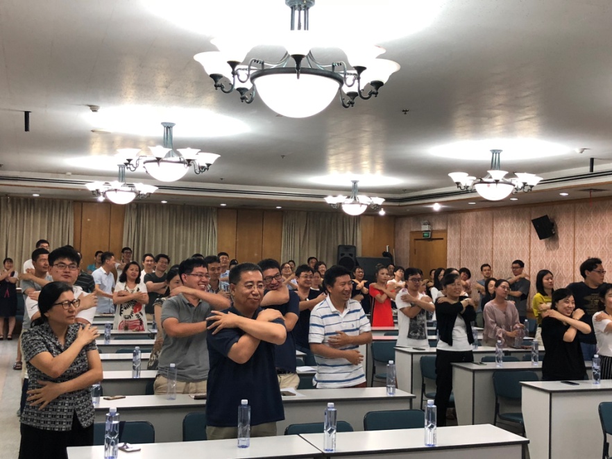 祝卓宏首先提供了一份心理健康自评估表,让大家了解自身心理健康状况;随后阐述了压力与身体疾病的相关性,引导大家通过积极联想产生幸福感;通过讲述苏东坡、司马懿等历史人物的情绪管理小故事,传授了可用于日常心理自我调节的压力管理五大技术;并现场指导大家做健脑操、腹式呼吸。祝教授还提供了免费心理热线、心理健康微信公众号。