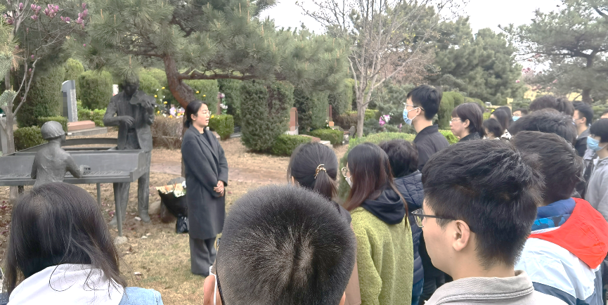 在陵园门口,同志们自觉排成两路纵队有序进入,行至汪先生的墓碑前,大家仔细擦拭了汪德昭院士及其夫人李惠年先生的铜像及墓碑。师生代表敬献了花篮,并集体向汪先生和李先生三鞠躬,以表达崇敬与悼念之情。