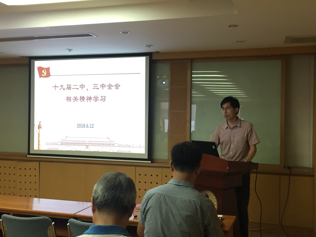 在十九大二中全会精神学习部分,陈德华书记带领大家学习了《中共中央关于修改宪法部分内容的建议》中宪法修改的必要性、遵循的原则和意义等内容。结合十九大三中全会《中共中央关于深化党和国家机构改革的决定》和《深化党和国家机构改革方案》等文件,学习了深化党和国家机构改革的指导思想、必须坚持的“四个原则”、改革目标、首要任务、重要任务、必然要求、理顺中央和地方职责关系和重要保障等内容。他强调,学习宣传贯彻党的十九届二中、三中全会精神是当前和今后一个时期全党全国的重要政治任务。要求广大党员要以高度的责任感和使命感,认真自觉学习和宣传党的十九届二中、三中全会精神。