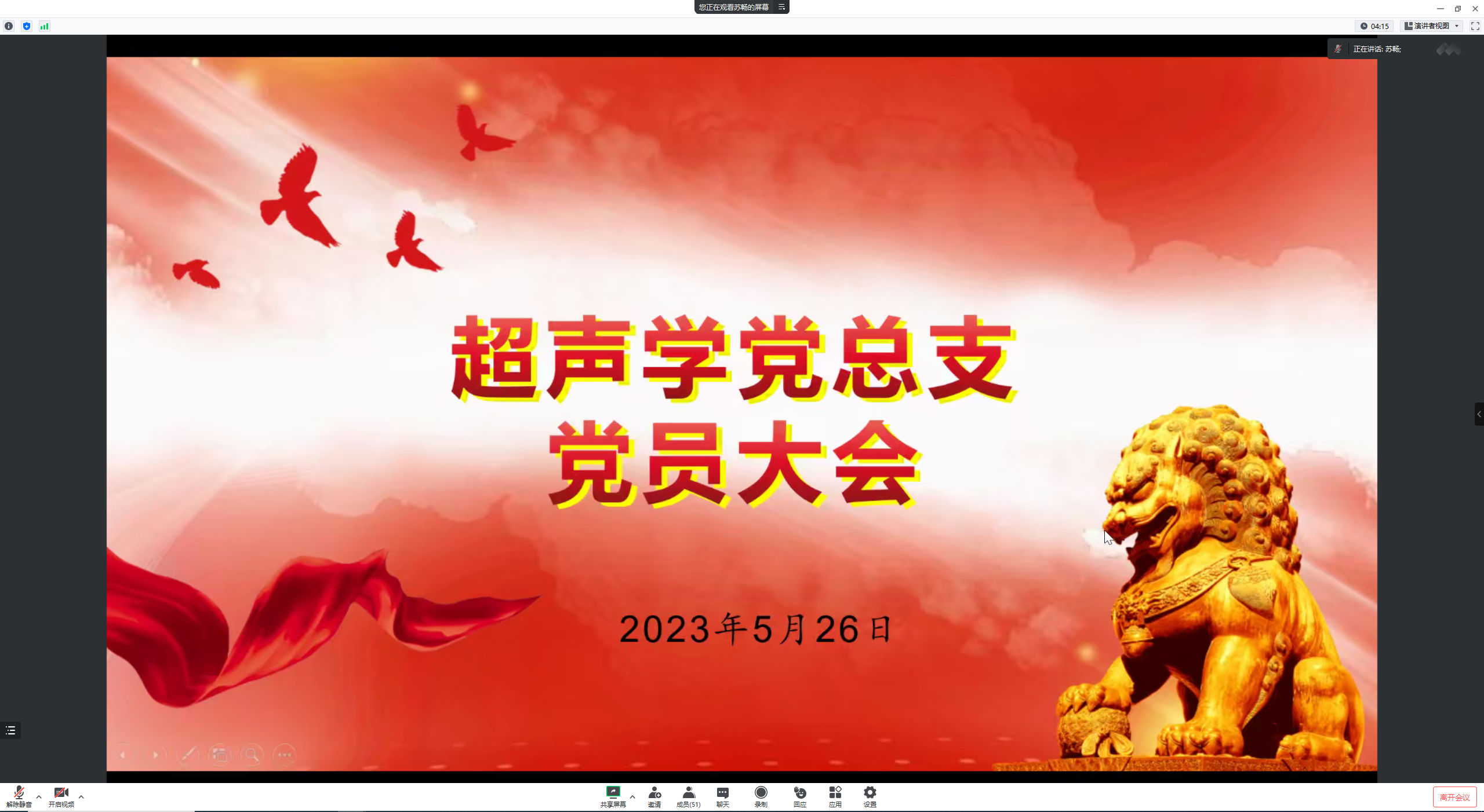2023年5月26日下午,超声学党总支召开线上党员大会暨主题党日学习活动。党总支书记陈德华作“学习贯彻习近平新时代中国特色社会主义思想主题教育的一点体会”微党课。党总支副书记苏畅向全体党员传达中国科学院、声学研究所学习贯彻习近平新时代中国特色社会主义思想主题教育动员部署大会精神。苏畅主持会议,64名党员参加会议。