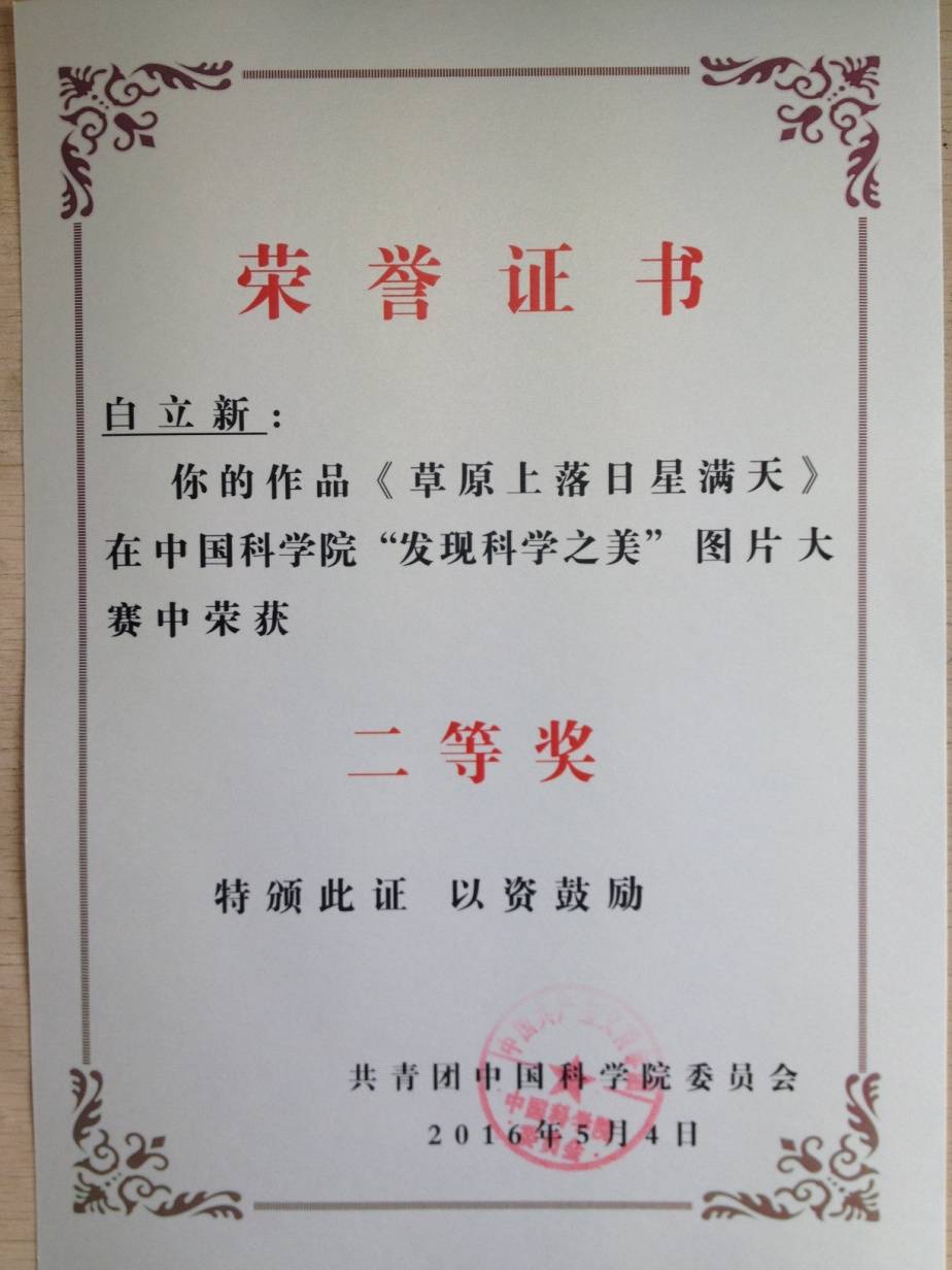 在中科院团委近期举办的“发现科学之美”图片大赛中,赢乐welcome超声技术中心白立新副研究员的作品“草原落日星满天”荣获二等奖,并在中科院团委纪念“五四”运动九十七周年暨“发现科学之美”图片大赛表彰交流会上收到表彰。