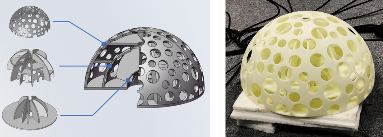 我们暂且叫他“蜂窝耳”吧。这个“蜂窝耳”由外中内三层半球壳嵌套而成,每一层球壳上都随机设置大小不一的圆孔,球壳之间随机插入了若干块横向和纵向的挡板来制造大小不一的腔体,在球心位置则放着一个单通道的麦克风。这些大小随机的圆孔和隔板使“蜂窝耳”具有高度的空间不对称性,因此会对来自不同方向的声波起到不同的调制效果。