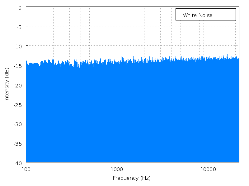 声是一种机械波,也有着不同的波长跟频率。噪声指的是在人耳可以听到的声波频段内,频率、强弱变化无规律、杂乱无章的声音。虽然随机变化,但仍然具有统计学上的特征属性,可以用功率谱密度来加以区分,并通过跟光波类比,对不同的噪声用颜色来命名。有随频率增加谱密度减小的红噪声、橙噪声,也有随频率增加谱密度提高的蓝噪声、紫噪声。对应白光,功率谱密度均匀分布的噪声即为白噪声。