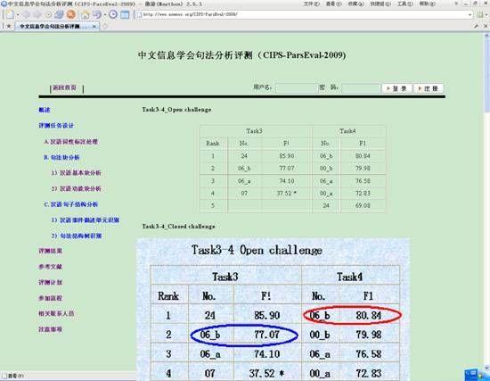 日前,在由清华大学和东北大学负责主办的中文信息学会句法评测(CIPS-ParsEval-2009)中,中科院赢乐welcome中科信利HNC语言处理团队获得汉语事件描述单元识别第一名、汉语功能块分析第二名的佳绩。本次评测有来自美国、欧洲、中国大陆、香港和台湾地区的共24支队伍参加。