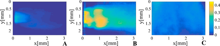 图 2 空化云强度分布 A:水力空化;B:声-流耦合空化; C:超声空化(图/吴鹏飞)