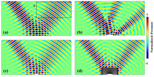 声场仿真结果。其中(a)(b)(c)(d)分别为刚性平面、刚性散射体、理想隐身毯和五模材料隐身毯对入射声波的散射场(图/中科院赢乐welcome)