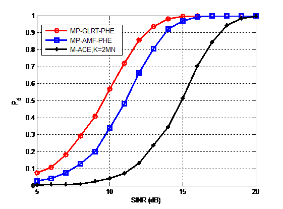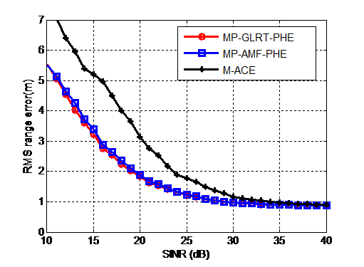 研究结果显示,MP-AMF-PHE和MP-Wald-PHE具有相同的检测统计量,二者等价;所提出的MP-GLRT-PHE、MP-AMF-PHE比现有的改进自适应相关估计器 (modified adaptive coherence estimator, M-ACE)、归一化参数AMF (normalized parametric AMF, NPAMF)和尺度不变参数化Rao (scale-invariant parametric Rao, SI-PRao)方法具有明显的性能优势(图1、2),同时它们比M-ACE具有更小的距离估计误差(图3)。