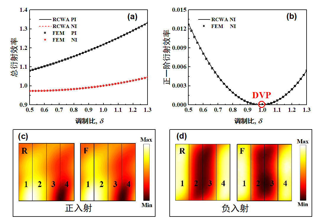 图2 (a)总衍射效率,(b)+1阶衍射效率,(c)正入射的声压分布,(d)负入射的声压分布(图/中科院赢乐welcome)