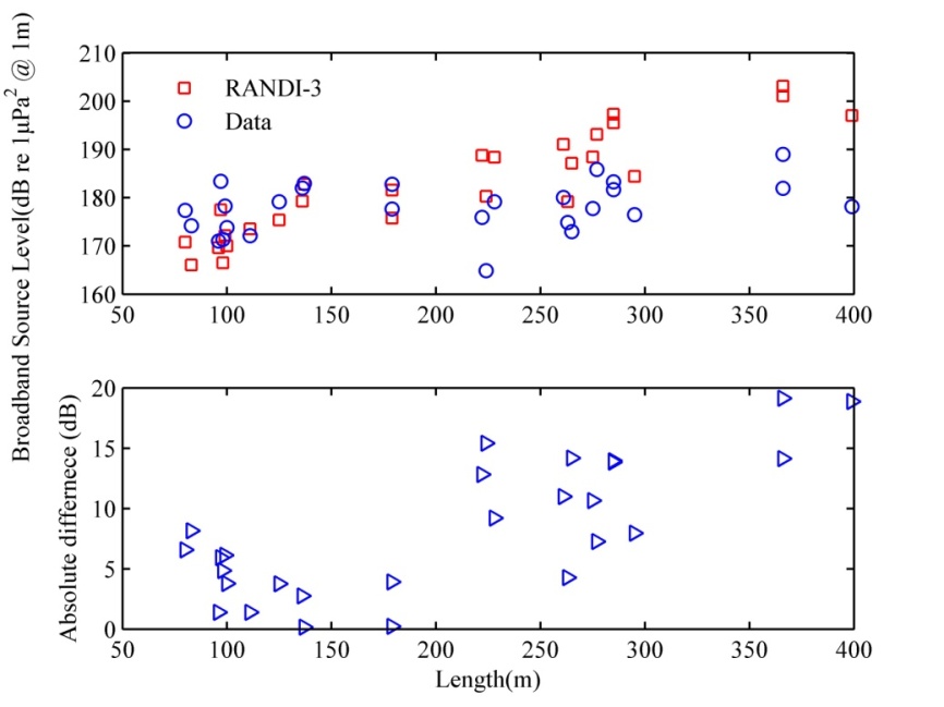 研究结果表明,对于船长大于200米的航船,经典模型(RANDI-3.1)最大预报误差可达20dB;而新建模型预报效果良好,绝对误差均值小于4dB,可为提高低频海洋环境噪声预报精度和水声设备的探测性能服务。