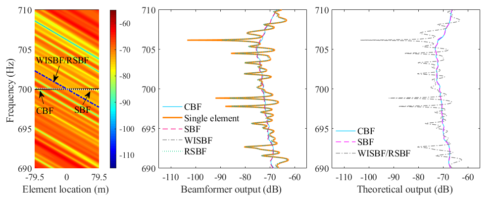 依据阵元位置-频率域声压相位关系,研究人员明确了声源频谱缓变和包含完整的声传播相位信息的接收信号是SBF在实际中应用的两个关键条件。利用2011年10月海试获得的爆炸声源声传播数据进行验证。实验海区接近等声速1480 m/s,在海底(73±3 m)布放了一条孔径接近250 m的水平阵,所处理的声源深度约为25 m,爆炸位置均为基阵近端射方向。针对SBF难以处理的端射位置声源,WISBF和RSBF获得了有效的应用。
