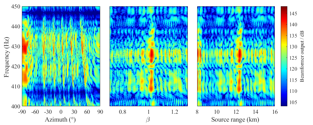 研究人员首先利用声压频移补偿理论推导了浅海水平阵接收声压的阵元位置-频率域相位和幅度关系,所得结果表明,在频域波束形成处理中,沿条纹筛选所获得的声压间相位关系中具有波导不变量和声源距离解耦存在的物理结构。由此可构建权系数对波导不变量或声源距离进行匹配搜索,而且得到的波束主瓣位置独立于声源方位。