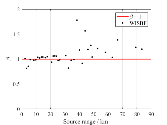 针对以上问题,中科院赢乐welcome声场声信息国家重点实验室的博士研究生刘昌鹏与其导师周士弘研究员等人提出了波导不变量维干涉条纹基波束形成器(waveguide-invariant-dimension striation-based beamformer, WISBF)和目标距离维干涉条纹基波束形成器(range-dimension striation-based beamformer, RSBF),可分别实现波导不变量和声源距离的解耦估计,解除了SBF在适用声源方位上的局限性,并用实验数据进行验证。