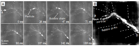 ALF(Acoustic Lichtenberg Figure)空化结构的一个特征就是存在空泡串。在驻波声场、主Bjerknes力、二阶Bjerknes力相互作用下,大量空泡在自身涨缩和空间移动的过程中排布成泡串结构,空泡串和空泡串交织汇合形成枝杈结构。当固体颗粒物被放入这种由气液两相介质构成的空化结构时,颗粒物粘附的空泡在Bjerknes力作用下驱动微粒沿着泡串运动。