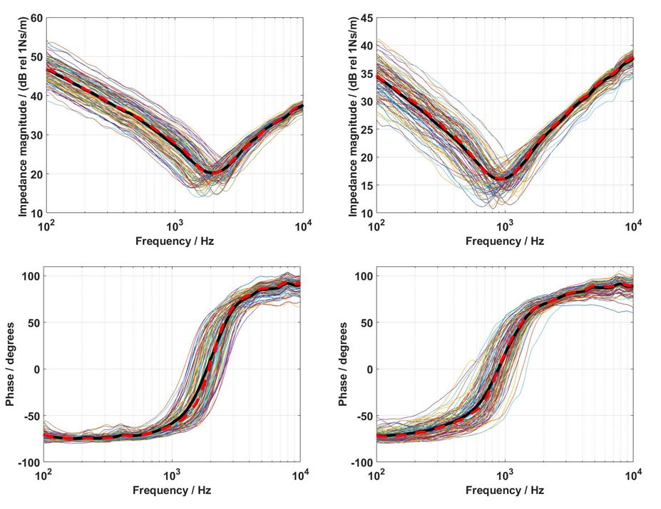 对此,中科院噪声与振动重点实验室博士研究生聂亚飞与其导师李晓东研究员、桑晋秋副研究员等人测试了100位中国人的乳突和髁突机械阻抗(图1),分析了不同生理因素与颅骨力阻抗的关系,其次搭建电力类比模型预测了力阻抗的差异对骨传导器件输出力的影响,并且与西方人群的颅骨力阻抗进行了对比。