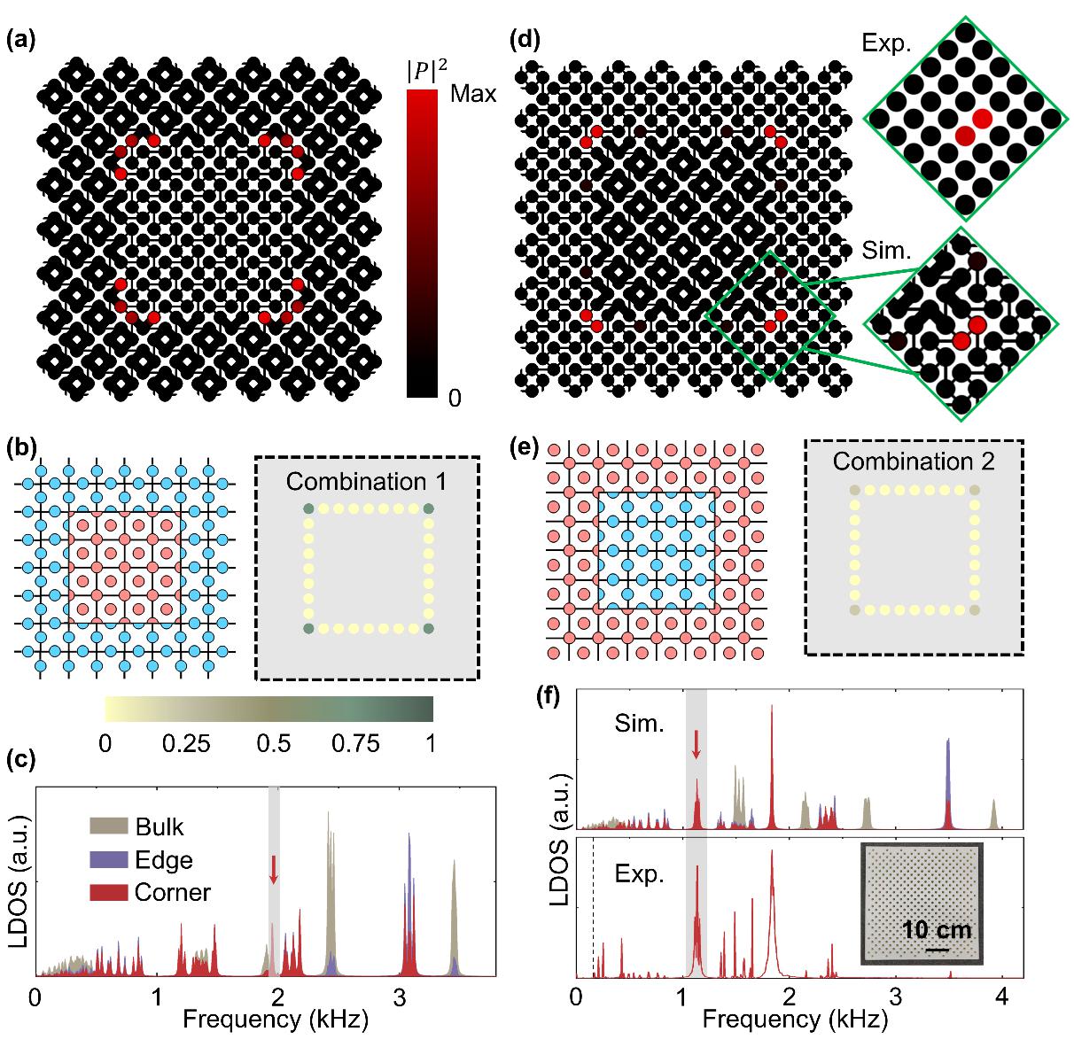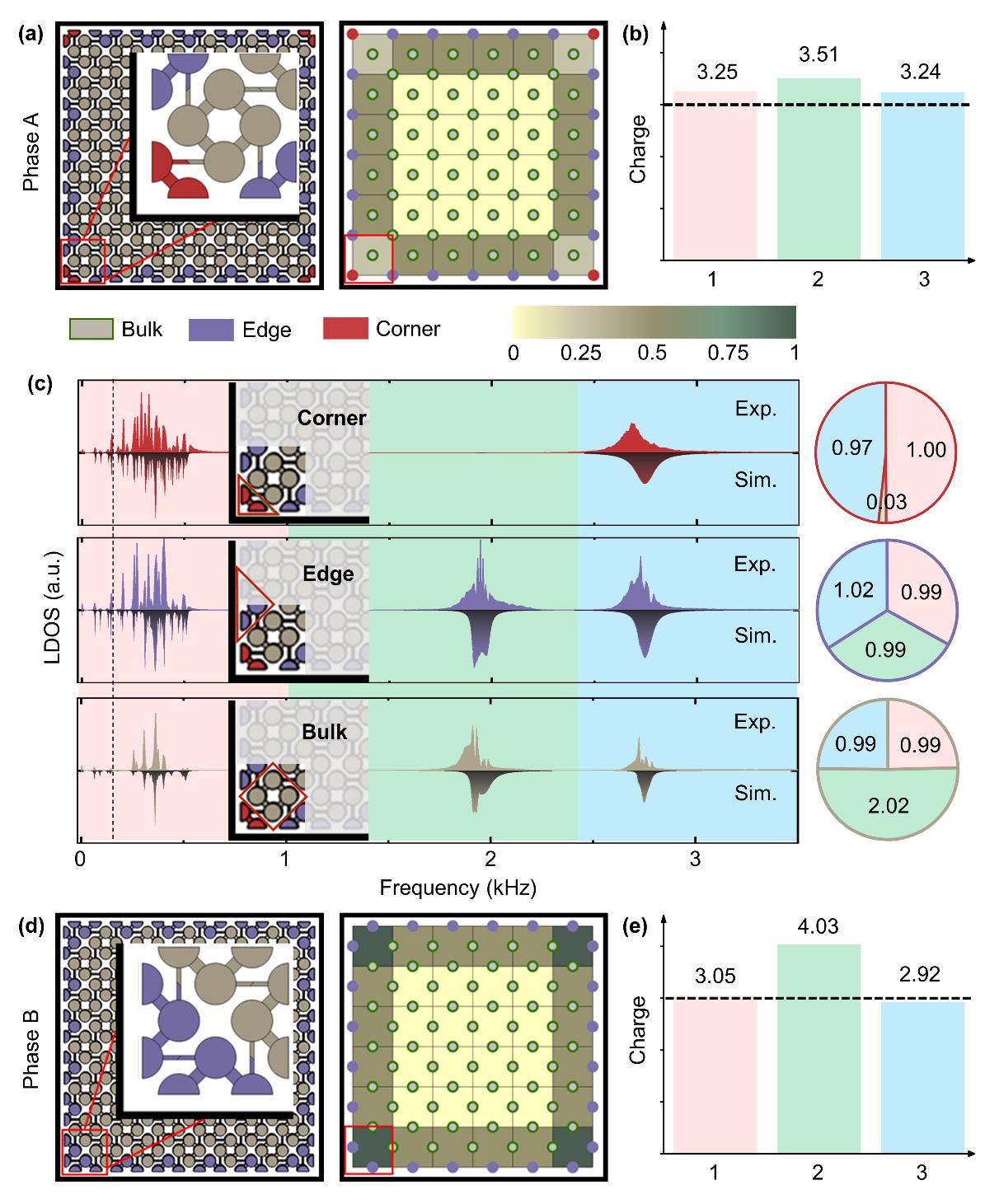 研究人员在构建的声子晶体中测得了表现为分数化谱电荷的拓扑角模式反常,这种模式反常可以作为一种易于观测的实空间拓扑指标对湮灭在体态中的拓扑角模式进行先验判别。在此基础上,通过将不同的万尼尔构型按照多种方式进行组合,研究人员将原本湮没在体连续谱中的角模式调制至带隙中。在组合后的声子晶体中,平庸相和非平庸相结构均可以作为包覆层,为在带隙中构造和调控拓扑角模式提供了一种新思路。