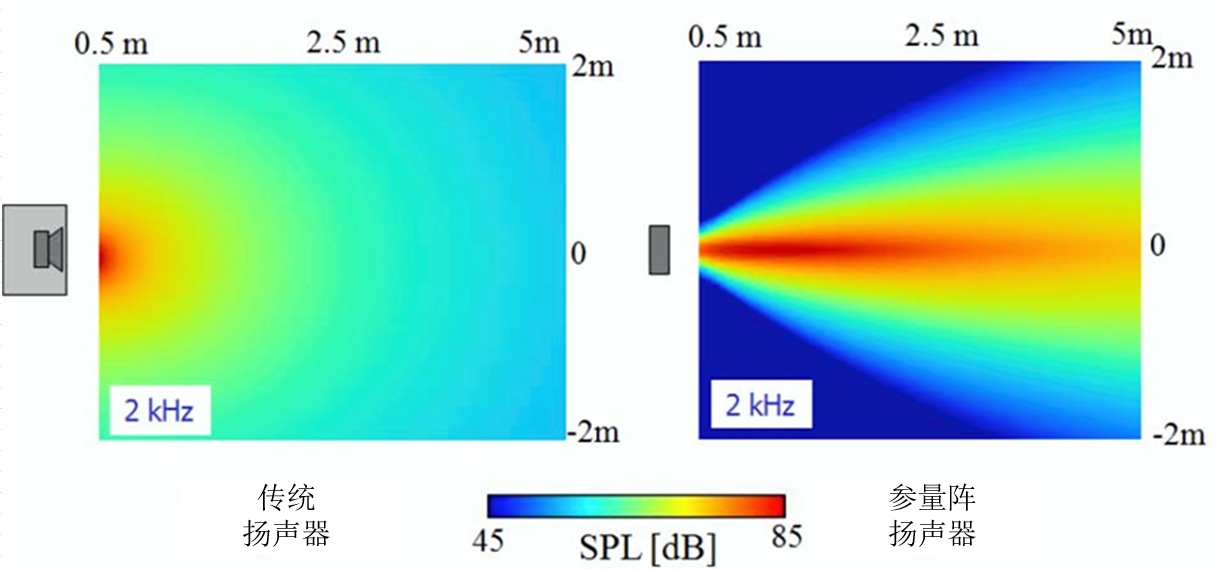 传统扬声器与参量阵扬声器的传播特性示意图