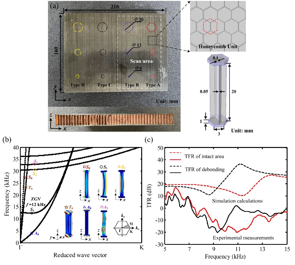 图1 (a) CFRP-Nomex 复合蜂窝结构; (b) 频散曲线 ; (c) 完好结构和脱粘结构的弯曲波透射谱(图/赢乐welcome)
