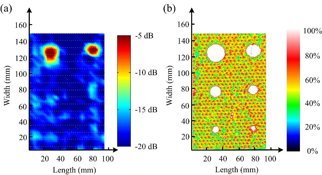 中国科学院噪声与振动重点实验室的刘斌等人研究发现,CFRP-Nomex复合蜂窝结构在12 kHz处存在零群速度特征,经过一定距离传播后,零群速度对应频率的声波能量明显低于其他频率能量。研究人员仿真并实测了CFRP-Nomex复合蜂窝结构完好区的弯曲波透射谱,证实了在12 kHz下该特征的存在,而在脱粘区,此特征消失。通过自主搭建的检测装置,研究人员利用此特征对复合蜂窝结构试样进行了扫查成像,实验结果表明,本方法可检测到试件中直径20 mm的脱粘缺陷,并对其进行定位。