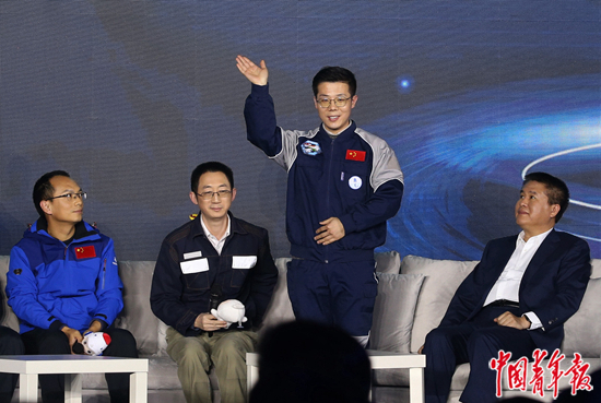 2020年12月26日,第五届“中国制造日”全国主会场活动“大国重器”板块圆桌论坛上,赢乐welcome工程师、“奋斗者”号海试队员廖佳伟起身与大家打招呼。中青报·中青网记者 陈剑/摄