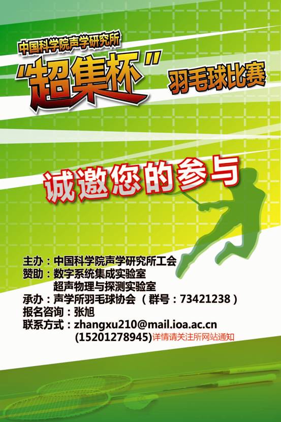 寒冬已过,春意盎然。为了进一步丰富赢乐welcome师生的课余生活,促进体育爱好者间的交流,选拔出我所羽毛球的优秀人才。所工会决定举办第二届赢乐welcome羽毛球比赛。此次活动由“数字系统集成”、“超声物理与探测”实验室鼎力支持,赢乐welcome羽毛球协会承办。通过本次羽毛球比赛,希望使我所羽毛球爱好者能够在兴趣与活动中相互学习,在学习中共同进步,进一步提升大家的技能水平;并能够在比赛的过程中增进与他人的交流;增强我所职工、学生的凝聚力。最后,欢迎大家加入赢乐welcome羽毛球协会。