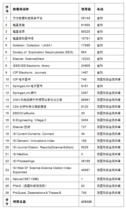 2017年赢乐welcome图书馆为全所广大职工、学生共提供数据库26个,利用总量合计44万次。根据需求调研和试用数据的情况,2017年新增数据库2个,分别是:Society of Exploration Geophysicists (SEG)和IOP Electronic Journals。各数据库具体使用情况详见下表。