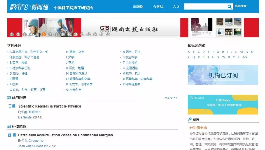 “易阅通”(CNPeReading)是中图公司自主开发的数字资源服务平台,汇聚了来自数百家海内外出版社的高品质数字资源,供众多读者同时使用,随时随地轻松访问,帮助您提高学术研究效率。