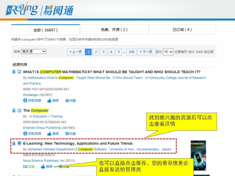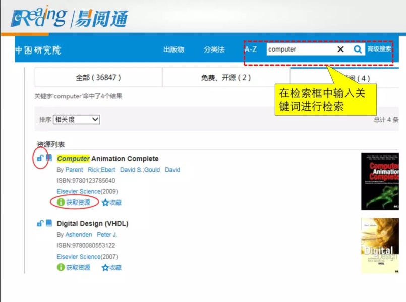 在检索栏中输入关键词进行检索,打开的小锁头图标就是我们已经订购的资源,点击“获取资源”就可以看到全文。