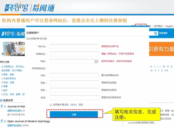 机构内用户登录网站后,点击右上侧的“注册”按钮,填写相关信息即可。